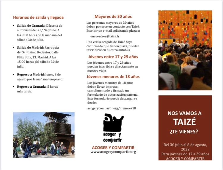 Los mayores de 30 años deben ponerse directamente en contacto con Taizé en este mail: encuentros@taize.fr. Cuando Taizé haya confirmado que tienen plaza pueden inscribirse en el autobús que tiene preparado Acoger y Compartir.